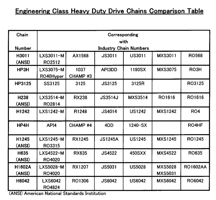 ในบ้านเราโซ่ประเภทนี้นิยมเรียกกันว่า โซ่ RO ซึ่งเป็นการเรียกชื่อตามเบอร์ซึ่งแตกต่างกันไปตามแต่ละแบรนด์ แต่ทุกแบรนด์สามารถเปรียบเทียบกันได้ตามตารางด้านล่าง
